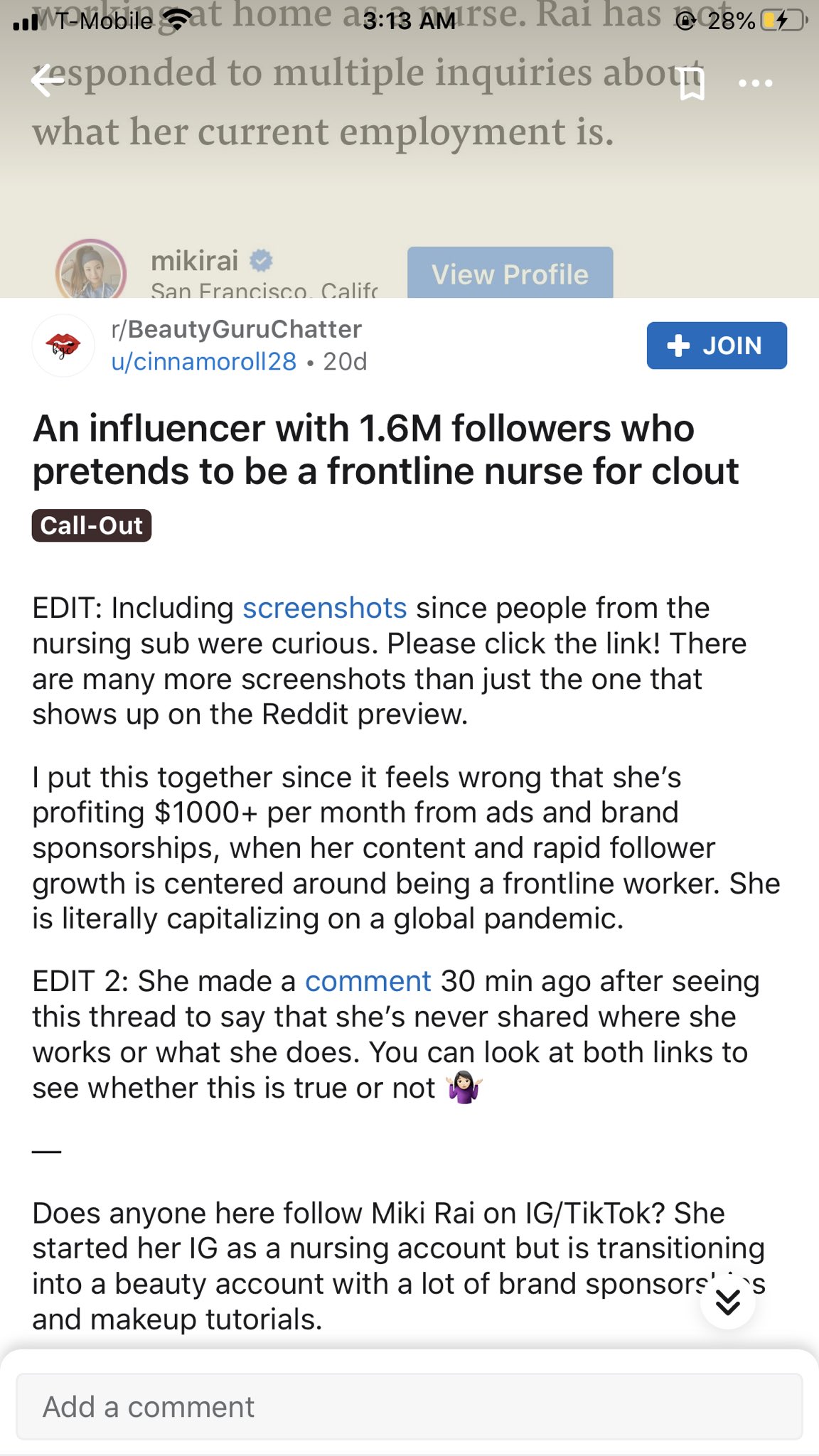 Jasmine On Twitter The Reddit Threads On R Nursing And R Beautyguruchatter Contain Screenshots That Show Months Of Content Where Miki Claimed To Be A Frontline Nurse While Wfh This Is Also Covered On